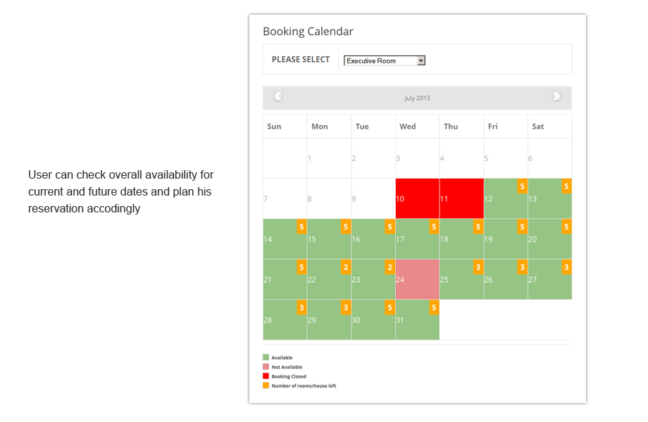 Booking calendars are provided with separate “Availability Calendar” pages and one in each venues/room's information/details page.