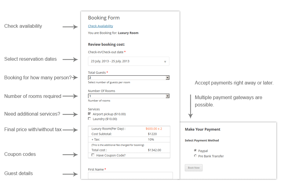 The booking form in this site is pre-loaded with typical fields, which you or we can adjust via the admin/back-end section of this booking tool/system. From there you can alsomanage the actual bookings, form fields, tax, deposits, services, emails and much more.